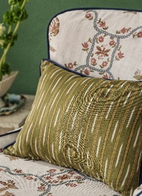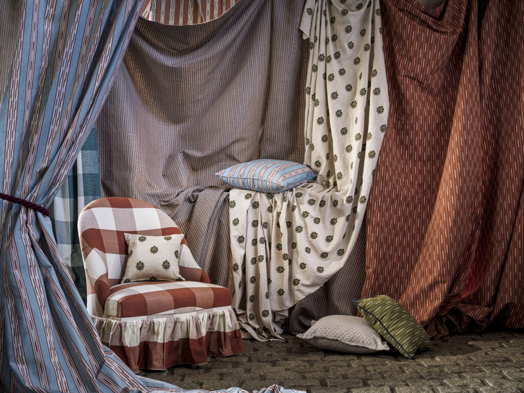 Com uma abordagem mais gráfica e contemporânea, Sabu Stripes and Ikats explora a intemporalidade das riscas e a riqueza visual dos padrões ikat. A coleção equilibra tradição e modernidade através de composições versáteis e combinações cromáticas cuidadosamente trabalhadas.